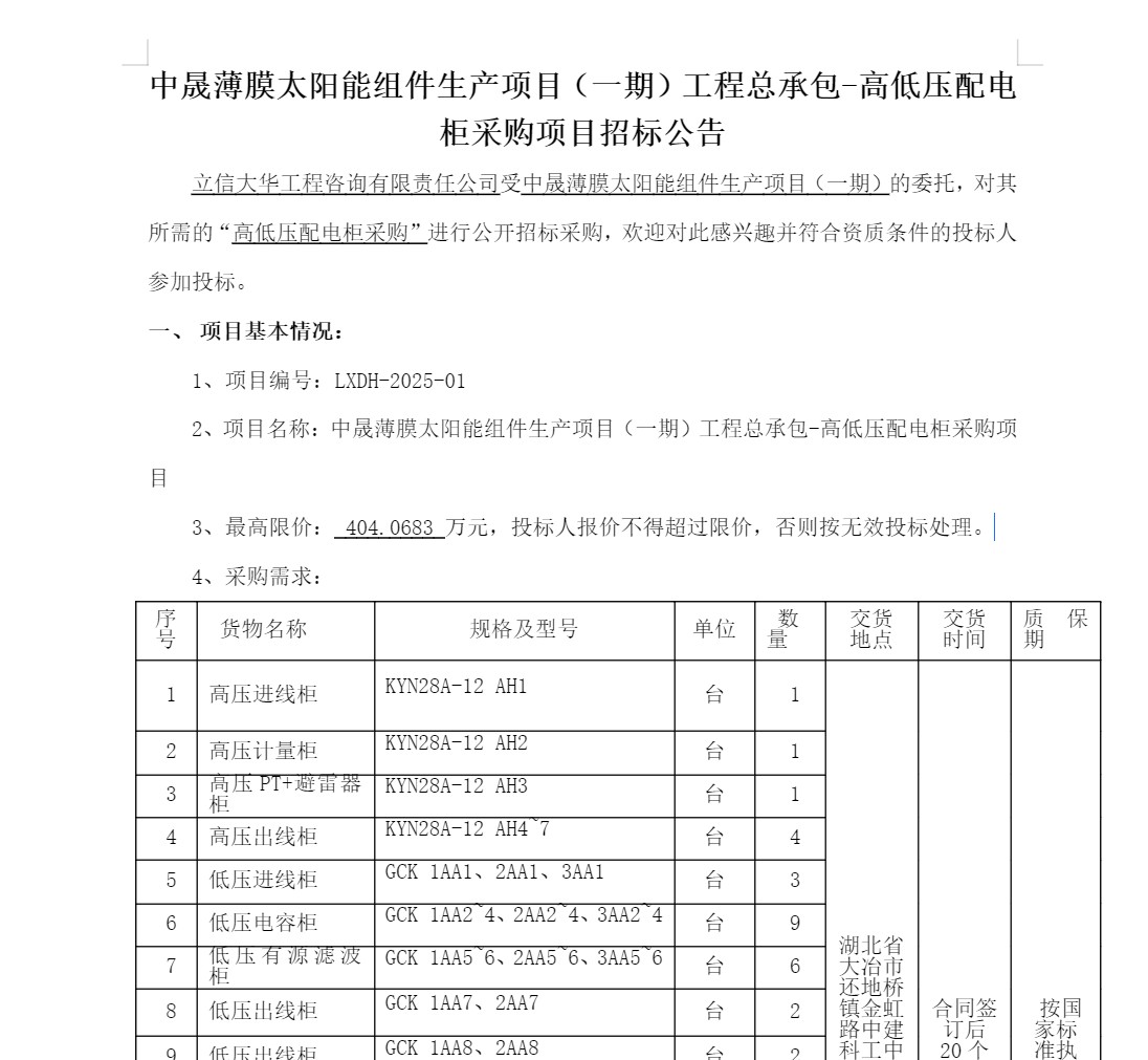 中晟薄膜太阳能组件生产项目(一期)工程总承包-高低压配电柜采购项目招标公告立信大华工程咨询有限责任公司受中晟薄膜太阳能组件生产项目(一期)的委托,对其所需的&l...