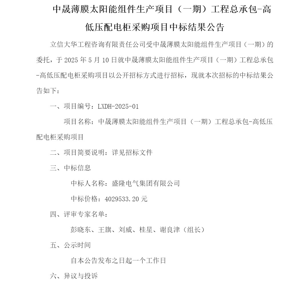 中晟薄膜太阳能组件生产项目(一期)工程总承包-高低压配电柜采购项目中标结果公告立信大华工程咨询有限责任公司受中晟薄膜太阳能组件生产项目(一期)的委托,于2025...